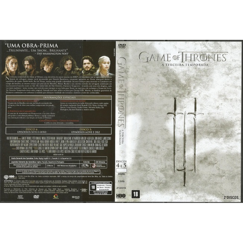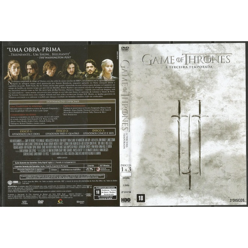 - Título Original: Game of Thrones - Third Season - Produtos Original: SIM - Usado (Uso Particular) - Direção: D.B. Weiss, David Benioff - Elenco: Peter Dinklage, Kit Harington, Emilia Clarke SEM RISCOS - TESTADO & FUNCIONANDO Capa Protetora envolvendo os DVD´s 5 DVD´s - 10 Episódios Box 1 - 3 DVD´s com Divisórias - DVD 1 - Episódios 1-2 - DVD 2 - Episódios 3-4 - DVD 3 - Episódios 5-6